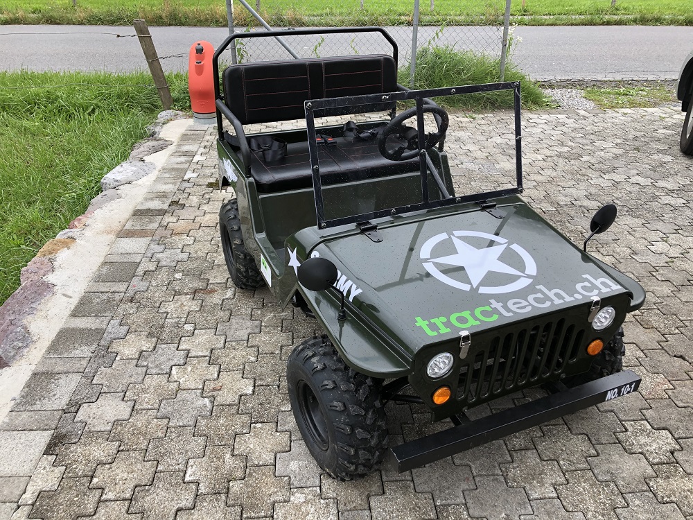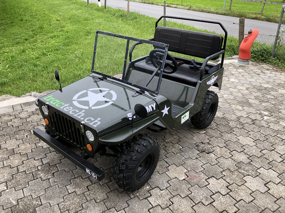 Luxusausführung, vorne Einzelradaufhängung, hinten Starrachse mit Differential-Ausgleichsgetriebe, gefedert, Federung einstellbar, breite Geländereifen, Sitzbank mit Sicherheitsgurten. Die Karosserie ist aus Hart-Kunststoff gefertigt und ist daher äusserst stabil. Geeignet ist dieser Jeep für Kinder ab ca. 10 Jahren, aber auch Erwachsene finden problemlos Platz.